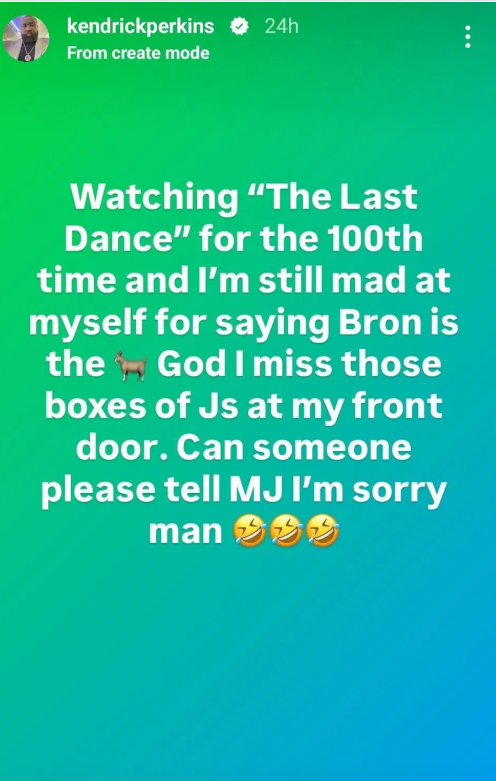 雷速体育7月13日讯 近日,前NBA球员帕金斯发布了Instagram动态,表示为自己曾经说勒布朗是历史最佳感到后悔,并且想给乔丹道歉。